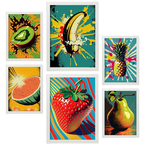 Set Di 6 Stampe Poster Estivi A Colori Di Frutta, Verdura E Cibo Sano In Stile Urban Art Interior Design A3 & A4 Cornice Bianca