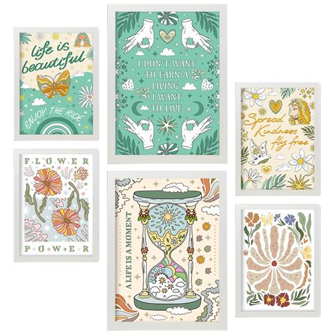 Set Di 6 Stampe Stampa Della Collezione Di Poster Live In Brilliant Groovy Style Con Cornici Decorative Per La Tua Casa. Stampa Artistica Da Parete. A3 & A4 Cornice Bianca