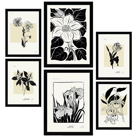 Set Di 6 Stampe Stampe Artistiche Floreali In Inchiostro Nero In Stile Schizzo Per L'interior Design A3 & A4 Cornice Nera