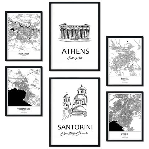 Set Di 6 Stampe Stampe Di Mappe E Monumenti D'europa In Bianco E Nero Per L'arredamento Della Tua Casa, Azienda E Ufficio A3 & A4 Cornice Nera