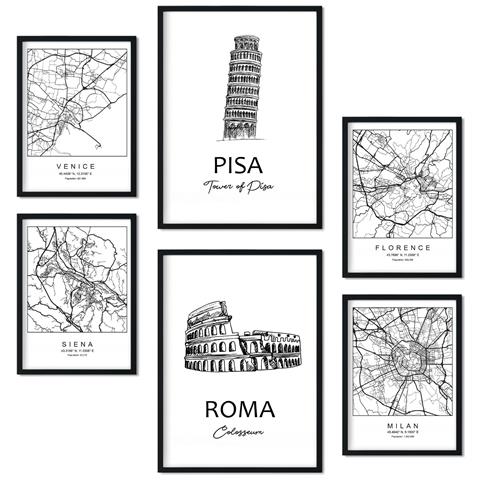 Set Di 6 Stampe Stampe Di Mappe E Monumenti Italiani In Bianco E Nero Per Il Design D'interni Della Tua Casa, Ufficio, Azienda A3 & A4 Cornice Nera