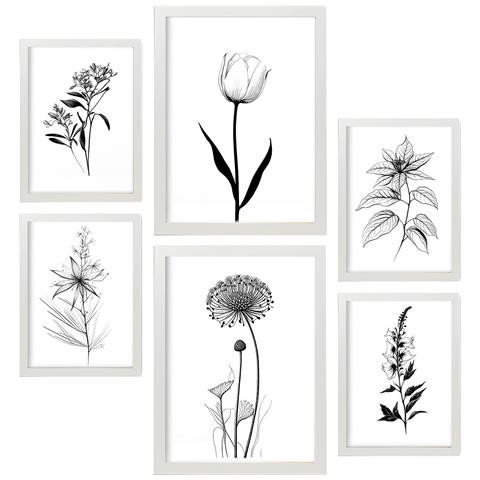 Set Di 6 Stampe Stampe Di Piccoli Fiori, Natura E Botanica Con Motivi Floreali In Un Classico Design D'interni In Bianco E Nero A3 & A4 Cornice Bianca
