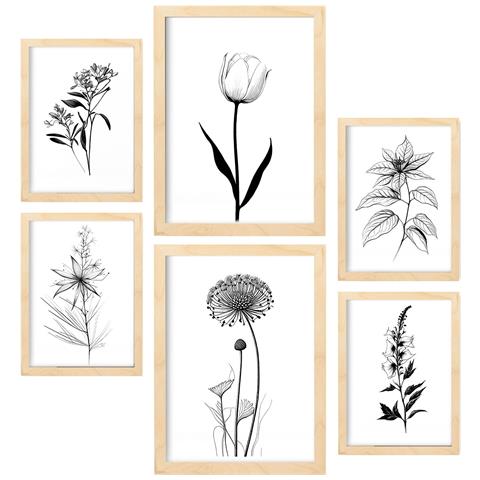 Set Di 6 Stampe Stampe Naturalistiche E Botaniche Con Piccoli Fiori E Motivi Floreali Nei Classici Bianco E Nero A3 & A4 Telaio In Legno Chiaro