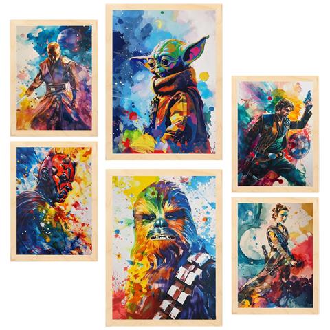 Set Di 6 Stampe Star Wars Colorato Incorniciato Con Illustrazioni Di Design Per Decorare Le Pareti Della Tua Casa A3 & A4 Telaio In Legno Chiaro