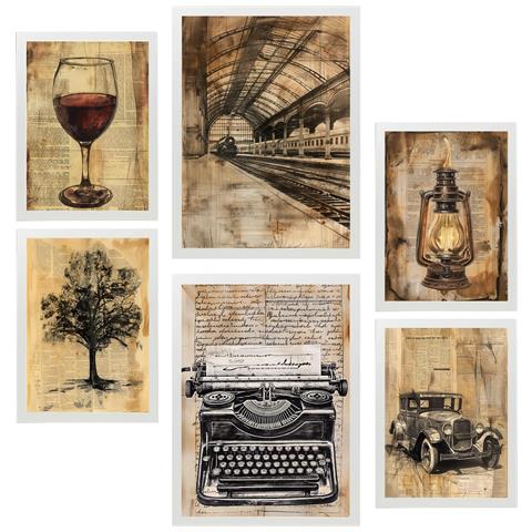 Set Di 6 Stampe Stile Di Vita Dello Scrittore Vintage Incorniciato Con Illustrazioni Di Design Per Le Pareti Casa Stanza Ufficio A3 & A4 Cornice Bianca