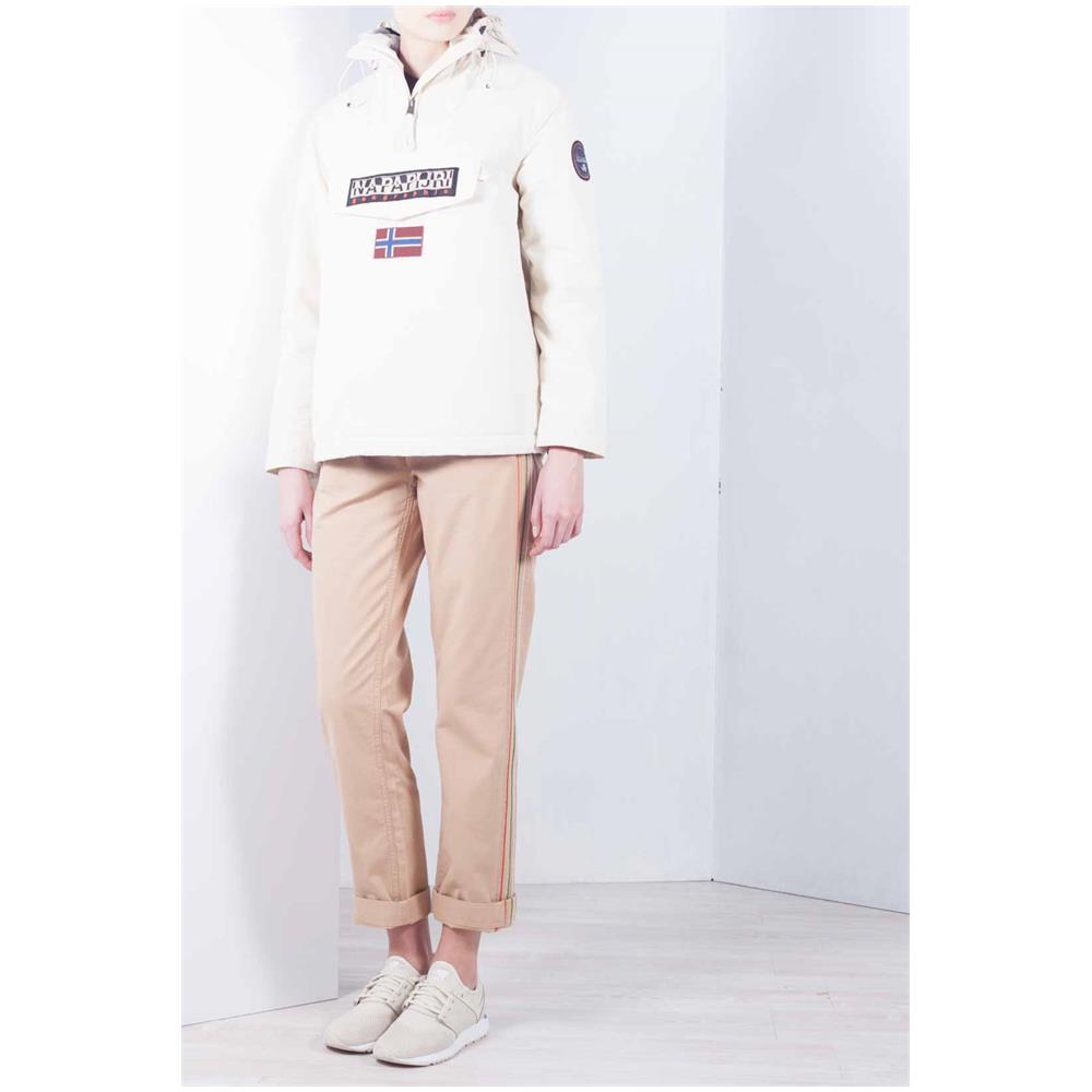 Iconica giacca anorak rainforest winter, realizzata in nylon spalmato bianco avorio. Caratterizzata dalla classica apertura a zip laterale con occhielli di areazione su entrambi i lati, ha un'imbottitura senza piuma con interno in felpa, polsini in maglia nascosti, cappuccio regolabile con bavero rialzato, e una tasca frontale con zip e patta, con il logo napapijri applicato a contrasto e il ti...