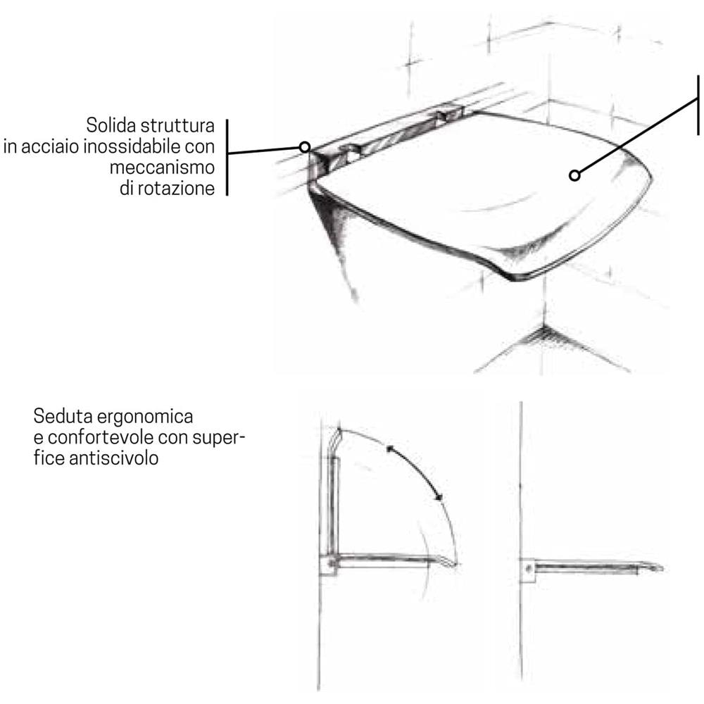 Azienda: novellini modello: sedile reclinabile colore: nero misura: larghezza = 38 cm profondità = 37 cm altezza / spessore = 7 cm descrizione: sedile reclinabile (portata massima 100 kg) sedile reclinabile a parete colore nero ral 7021, con struttura in metallo cromato solida struttura in acciaio inossidabile con meccanismo di rotazione seduta ergonomica e confortevole con superficie antiscivo...