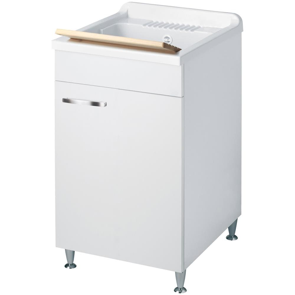 Classica Lavatoio Montato Misura 45x60 L45 P60 H85 Cm Colore Bianco Base Mobile Nobilitato Idrofugo Vasca Polipropilene Asse Pino Verniciato Piedini Regolabili Cerniere Anta Chiusura Rallentata Sportello Arrotondato Maniglie Piedini Cromati