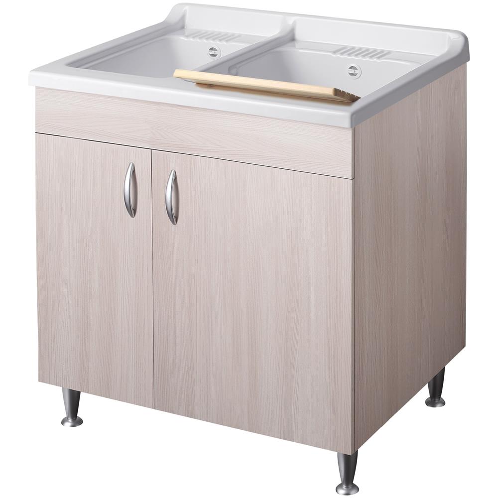 Eco Lavatoio Montato Misura 75x60 L75 P60 H85 Cm Colore Olmo Interno Bagno Lavanderia Base Mobile Nobilitato Idrofugo Legno Vasca Bivasca 2 Vasche Polipropilene Asse Pino Verniciato Piedini Regolabili Ante Battenti Economico Qualità Medio Alta