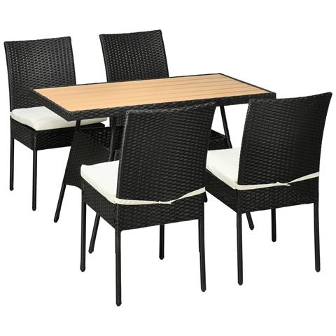 Riunisci amici e familiari intorno a un tavolo per pranzi e chiacchiere in compagnia: ci pensa outsunny a darti l'arredo giusto. Questo set composto da un tavolo con 4 sedie, è realizzato con telaio in acciaio robusto e rivestito con rattan pe resistente alle intemperie. Il piano del tavolo in plastica con effetto legno è solido e facile da pulire. Le sedie con schienale alto e cuscino morbido ...