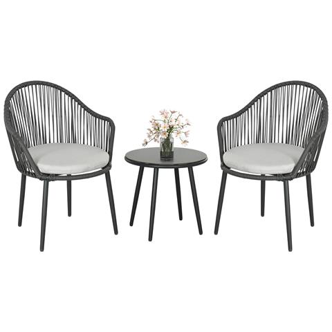 Crea un angolo relax all'aperto con il set da giardino Outsunny, composto da 2 poltroncine per esterno e un tavolino rotondo. Ogni poltrona da giardino è rivestita con elegante rattan PE ed è completa di morbidi cuscini di seduta, per renderle belle e confortevoli. Il piano in vetro del tavolino aggiunge un tocco chic, è una superficie ideale per appoggiare drink e snack ed è facile da pulire. ...