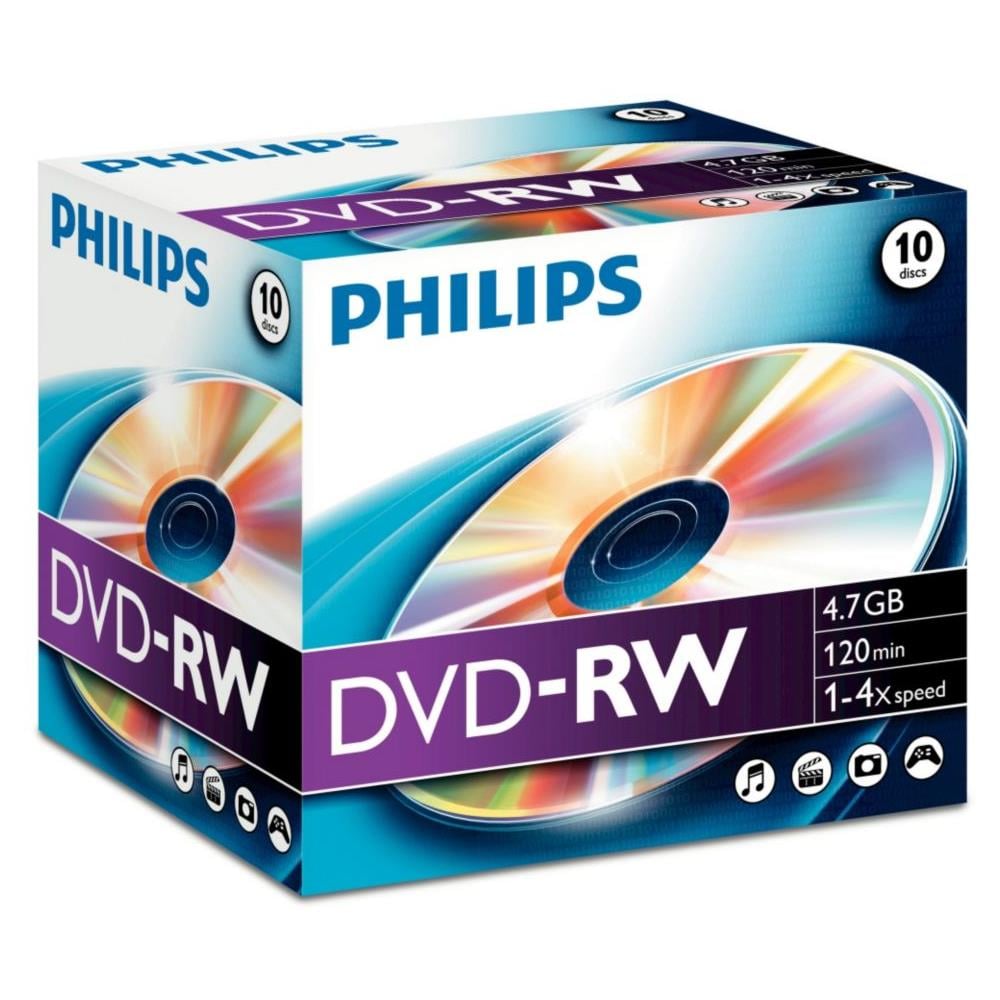 Philips DVD-RW DN4S4J10C / 00. Capacità originaria: 4,7 GB, Tipo: DVD-RW, Quantità per pacco: 10 pezzo (i) . Larghezza imballo: 145 mm, Profondità imballo: 105 mm, Altezza imballo: 127 mm