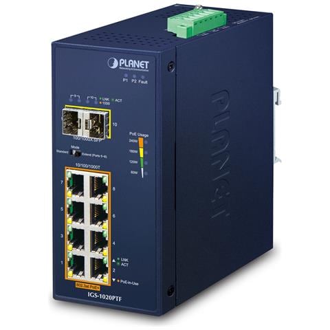 PLANET IP30 Ind 8-P 10/100/1000T. Tipo interruttore: Non gestito. Tipo di porte RJ-45: Gigabit Ethernet (10/100/1000), Quantità di porte RJ-45: 8. Full duplex. Dimensioni tavola MAC: 8000 voci, Capacità di commutazione: 20 Gbit/s. Standard di rete: IEEE 802.3, IEEE 802.3ab, IEEE 802.3af, IEEE 802.3at, IEEE 802.3az, IEEE 802.3u, IEEE 802.3z. Voltaggio input DC: 48 - 56 V. Supporto Power over Eth...