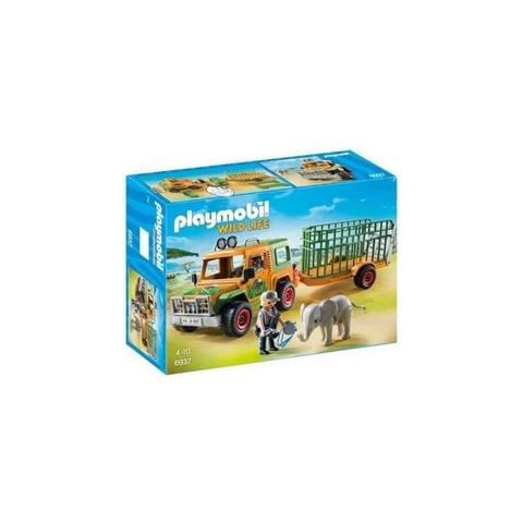 Jeep Rangers + gabbia da trasporto. Con cucciolo di elefante. Dimensioni : 37 x 11 x 10,5 cm. Il portellone della gabbia si apre completamente e funge da rampa di carico. Il tetto della jeep è removibile per permettere il posizionamento dei personaggi (fino a 2) . Le ruote di jeep e rimorchio possono essere smontate per la riparazione in caso di foratura. Include molti accessori come fucile spa...