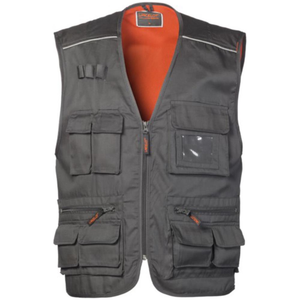 Gilet estivo rossini – lancelot modello florida scollo a v, chiusura anteriore con cerniera, carrè anteriore con profilo rifrangente a contrasto, un taschino applicato al petto sinistro con soffietto chiuso con aletta e velcro, portabadge in pvc chiuso con velcro applicato sul taschino sinistro, due taschini portacellulare con soffietto chiusi con aletta e velcro applicati al petto destro, port...