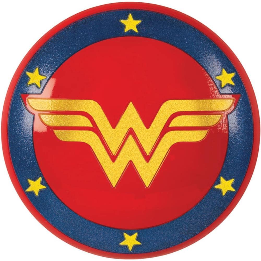 Questo accessorio è uno scudo per bambini in licenza ufficiale wonder woman. Lo scudo misura circa 33 cm di diametro. Questo scudo è blu e rosso con decorazioni dorate. Si impugna facilemente grazie ad una maglia posta sul retro. Questo accessorio è perfetto per completare un travestimento da wonder woman per carnevale e feste a tema.