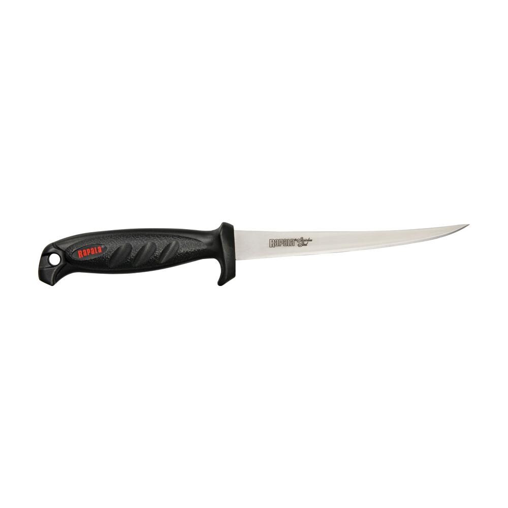 Coltello da Pesca Rapala Deluxe Falcon Fillet. Lama fillet in acciaio di 15 centimetri. Manico nero ergonomico. Fodero da cintura in plastica di alta qualita' con affilatore in pietra.