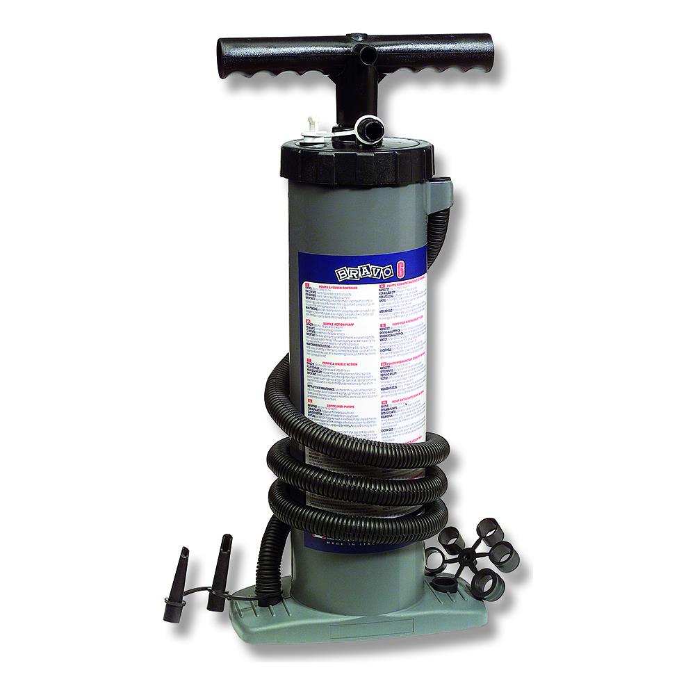 Bravo 6. Gonfiatore a flusso continuo, corpo in abs, volume 2x2500 cc. Rimuovendo il tappo la pompa diventa a flusso semplice, consentendo di gonfiare alla massima pressione con sforzo limitato. Dim. Mm. 210x120x470 h.