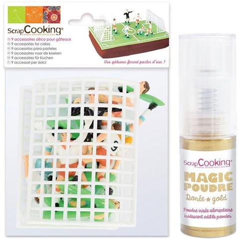 Tuo figlio, vostro marito o uno del tuo amico è un grande sostenitore e appassionato di calcio? Niente di meglio che fargli una torta a forma di campo di calcio con questi 9 accessori decorativi. Sarete in grado di trovare molti jouers con due squadre diverse, una guardia, il gioco della palla e gli obiettivi di gabbie. Accessori in plastica per la decorazione della torta scrapcooking innova co...
