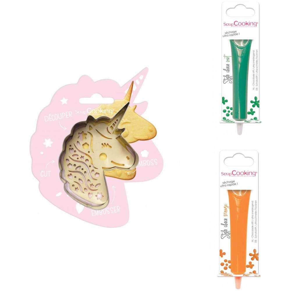 Questo set di cutter e embosser e due coloratissime penne al cioccolato sono gli accessori perfetti per creare e decorare biscotti unicorno, frollini o qualsiasi altra idea da forno! Il design preciso della taglierina e dell'embosser darà al biscotto una forma di unicorno e imprimerà i dettagli degli animali, per poi disegnare o scrivere con le penne di cioccolato. Perfetto come regalo per un a...