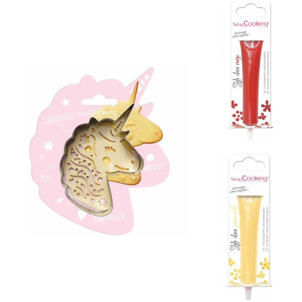 Kit Biscotti Unicorn Relief + 2 Penne Al Cioccolato Pastello Rosso E Giallo