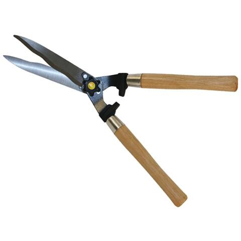 Cesoia da cm. 26 con lame ondulate in acciaio al carbonio trattate a caldo e una lama ricoperta al teflon. Regolazione lame e ammortizzatori antischiaccio interni. Manici in legno di frassino.