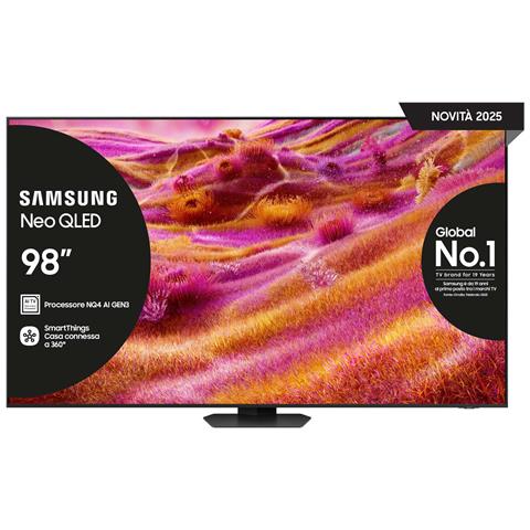 Samsung Smart TV 98” QE98QN90FATXZT Neo QLED 4K Mini LED 2025. Dimensioni diagonale schermo: 2,49 m (98"), Risoluzione del display: 3840 x 2160 Pixel, Tipologia HD: 4K Ultra HD, Tecnologia display: Neo QLED, Forma dello schermo: Piatto. Smart TV. Tecnologia di interpolazione del movimento: Motion Xcelerator. Formato del segnale digitale: DVB-C, DVB-S2, DVB-T2. Wi-Fi, Collegamento ethernet LAN. ...
