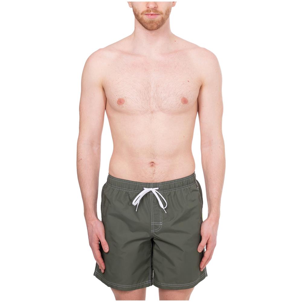 Costume da surf uomo in taffeta liscio di nylon verde militare ad asciugatura rapida, con lunghezza sopra al ginocchio e iconico motivo arcobaleno sul retro, vita elasticizzata con coulisse logo, e tasca posteriore con logo sundek applicato sulla patta. - vita media regolabile- tasche oblique sul fronte- slip interno in rete di nylon- tasca posteriore con patta, velcro, laccio portachiavi inter...