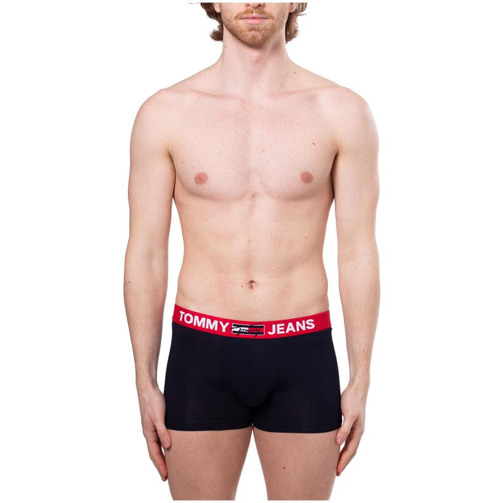 Boxer uomo aderenti in jersey stretch fine di cotone organico blu navy, dalla vestibilità regolare e a vita leggermente alta, con fascia elasticizzata in rosso a contrasto e logo tommy jeans intarsiato sul fronte con bandiera e logo firma. - vita con fascia elastica- tasca frontale sagomata- dettagli signature.