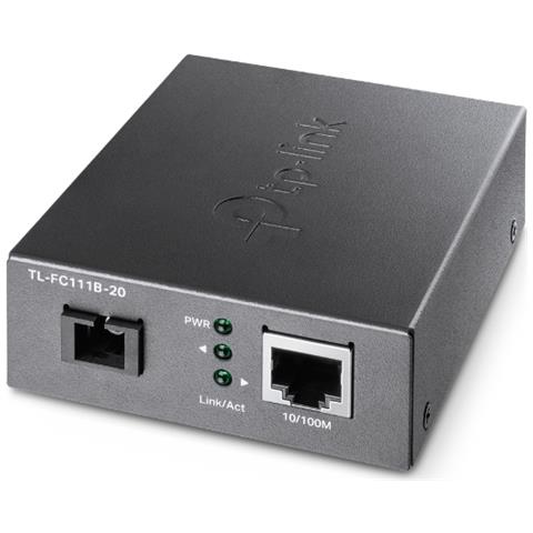 TP-Link TL-FC111B-20. Velocità massima di trasferimento dati: 100 Mbit/s, Standard di rete: IEEE 802.3, IEEE 802.3i, IEEE 802.3x, Tecnologia Ethernet su cavi in rame: 10BASE-T, 100BASE-T. Distanza massima di trasferimento: 20000 m, Struttura della modalità di fibra: Modalità singola, Diametri del cavo in fibra supportato (anima guaina): 9/125 µm. Indicatori LED: Attività, Collegamento, Potenza,...