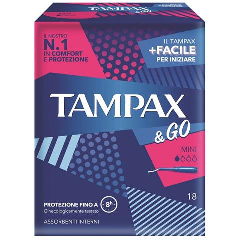 Tampax & go mini descrizionetampax & go è un tampone con applicatore in plastica, presa antiscivolo e punta arrotondata. si adatta perfettamente alla forma del corpo evitando fuoriuscite. Per flussi da molto leggeri a leggeri. Per una protezione discreta e confortevole durante tutto il ciclo mestruale. Pratici e facili da indossare grazie al loro applicatore. formato confezione da 18 assorbenti...