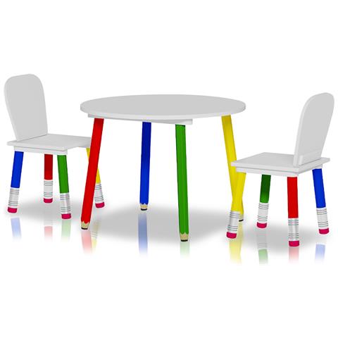 I tuoi bambini passeranno tantissime ore di divertimento con questo bellissimo set composto da 2 sedie con tavolo! realizzato interamente in legno mdf con piano di lavoro e sedute in colore bianco, mentre le gambe dell'intero set sono realizzate con delle bellissime matite colorate con colori vivaci e divertenti. Un bellissimo set dove i tuoi figli potranno scatenare la loro creatività nel dise...