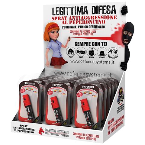 Pallbox in cartone da banco. Composto da blister di bombolette da 15 ml a getto spray nebulizzato orticante al peperoncino. Prodotto indicato per la difesa personale, libera vendita ai maggiori di 16 anni, decreto legge del 12-05-2011 n. 103.. Totale 18 pezzi. inteso per : 1 cf.