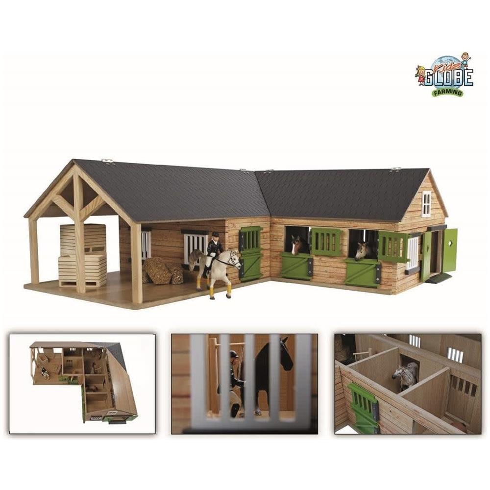 Colore: Grigio, multicolore. Materiale: Legno. Dimensioni: 68 x 77 x 27 cm (L x P x A). Scuderia ad angolo per cavalli giocattolo con 4 box e deposito. Scala: 1:24. Facile da assemblare. Accessori giocattolo non inclusi. AVVERTENZA: Non adatto per i bambini al di sotto dei 36 mesi. AVVERTENZA: Solo per uso domestic.