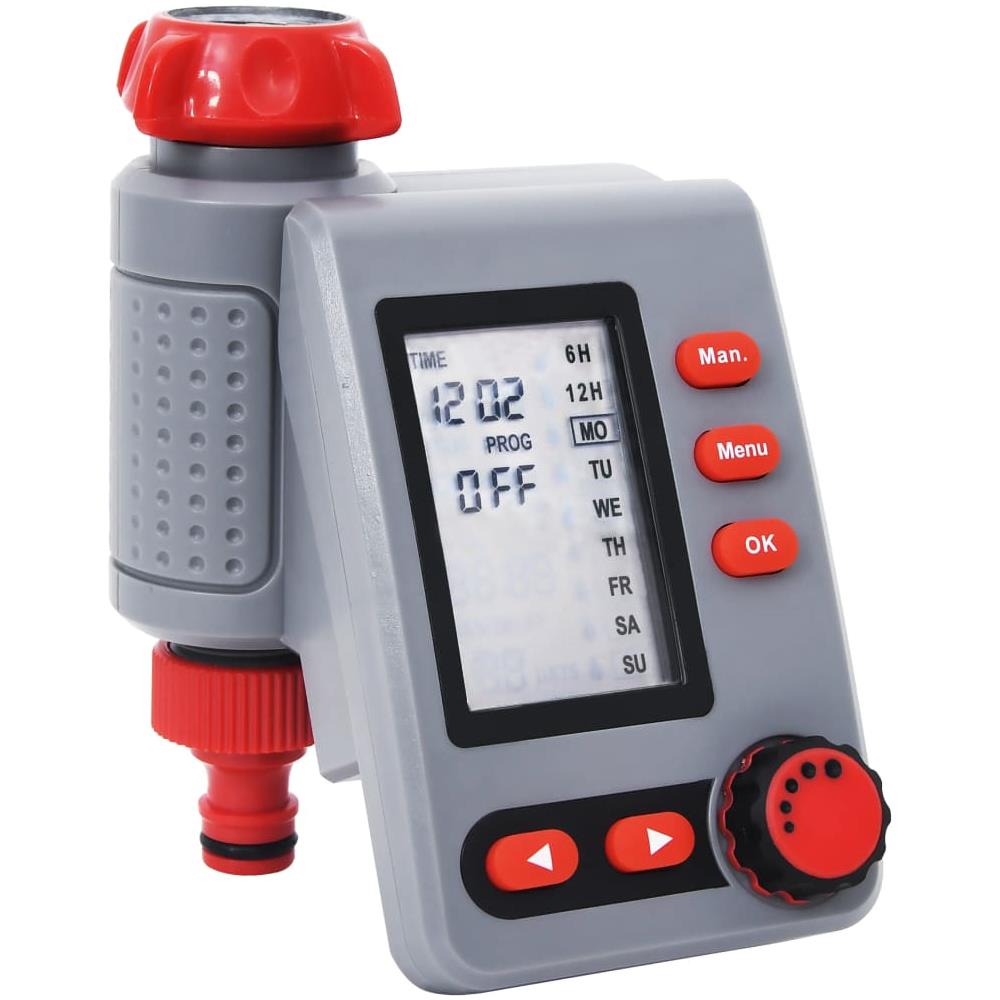 Colore: Grigio e rosso. Materiale: Plastica. Tensione: DC 3V. Grado di protezione IP: IP X6. Pressione dell'acqua: 0,5-8 bar. Tempo di irrigazione manuale programmabile: Fino a 4 ore. Tempo di irrigazione: Regolabile, da 1 minuto a 4 ore. Schermo LCD facile da leggere. Con uscita singola. Adatto per rubinetti da 26,5 mm (G 3/4"").