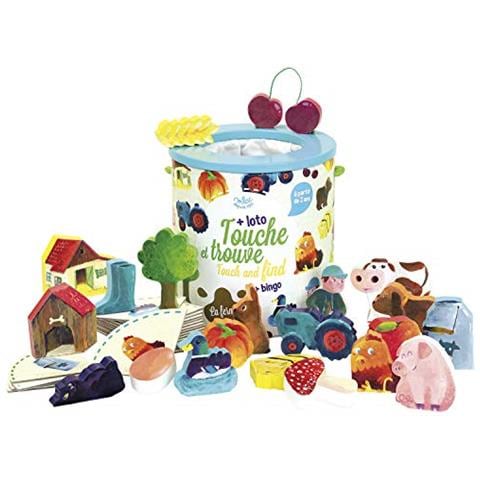 Il nostro imperdibile gioco touche e trova declinato in una versione ferma. Il tocco e trova un gioco di riconoscimento tattile che consiste nel mettere la mano nella borsa per ritrovare le monete senza guardare composto da un barile portaoggetti, di 21 pezzi in legno di cui una trappola, di 20 carte illustrate intorno al tema della fattoria.