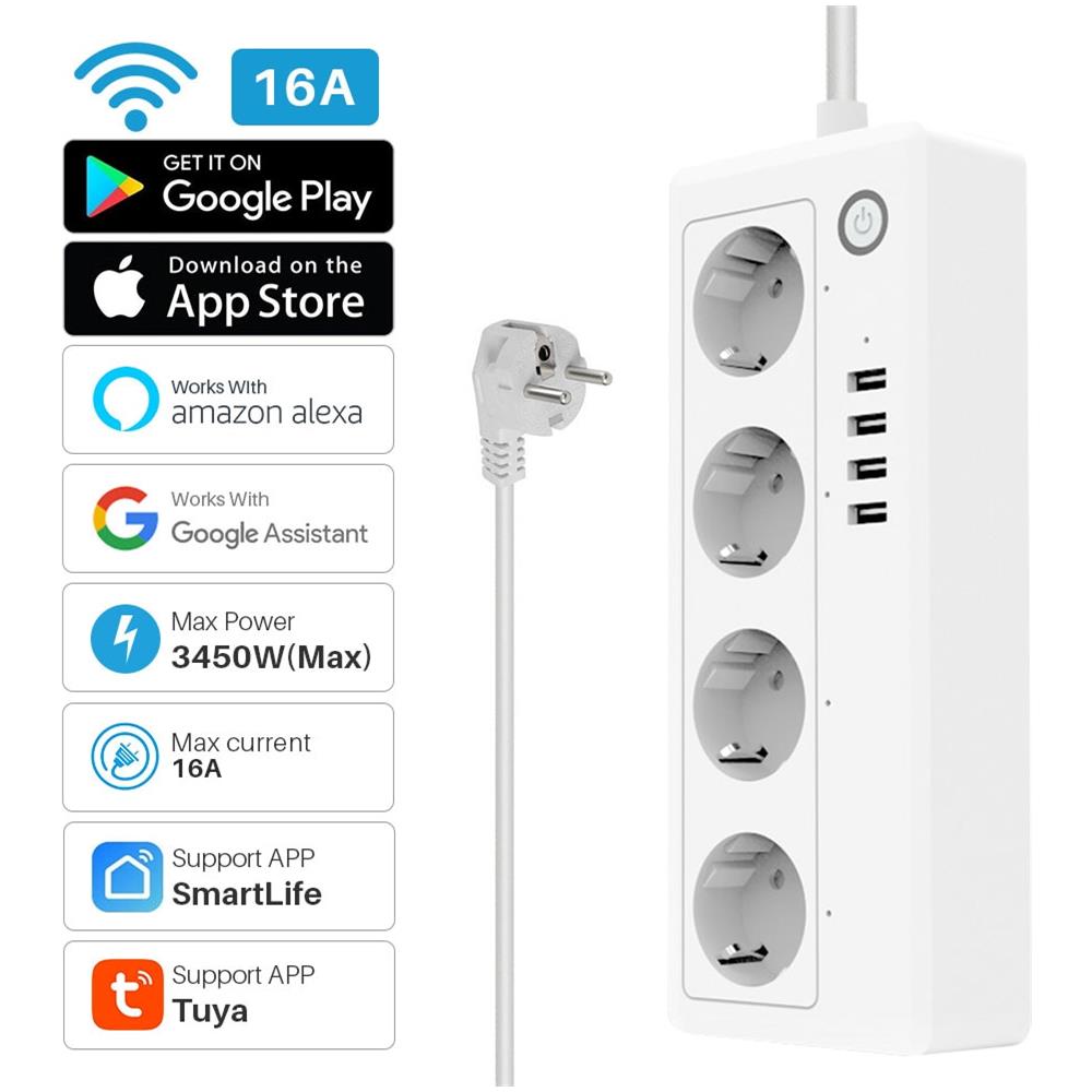 Tuya wi-fi smart power strip descrizione: materiale: abs (acrilonitrile-butadiene-stirene) + materiale pc ignifugoalimentazione: ac100-240v 50/60hz potenza in uscita: 16 a maxpotenza in uscita usb: 3,1 afrequenza wfii: 2,4 ghz 802.11b / g / nporta usb: 4 livello di sicurezza della rete: wpa / wpa2temperatura operativa: 0°c~40°c (32°f~104°f) umidità operativa: 20%~85%temperatura di stoccaggio: 0...