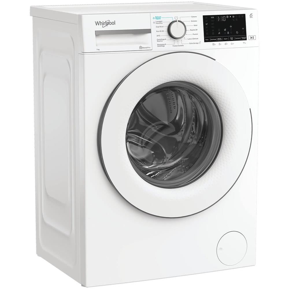 Whirlpool Lavatrice a libera installazione - WAM 762W IT. Tipo di carica: Caricamento frontale. Capacità cestello: 7 kg, Classe di efficienza della centrifuga: B, Silenziosità (centrifuga): 76 dB, Velocità di centrifuga massima: 1200 Giri/min. Colore del prodotto: Bianco. Larghezza: 600 mm, Profondità: 496 mm, Altezza: 845 mm. Classe efficienza energetica: A