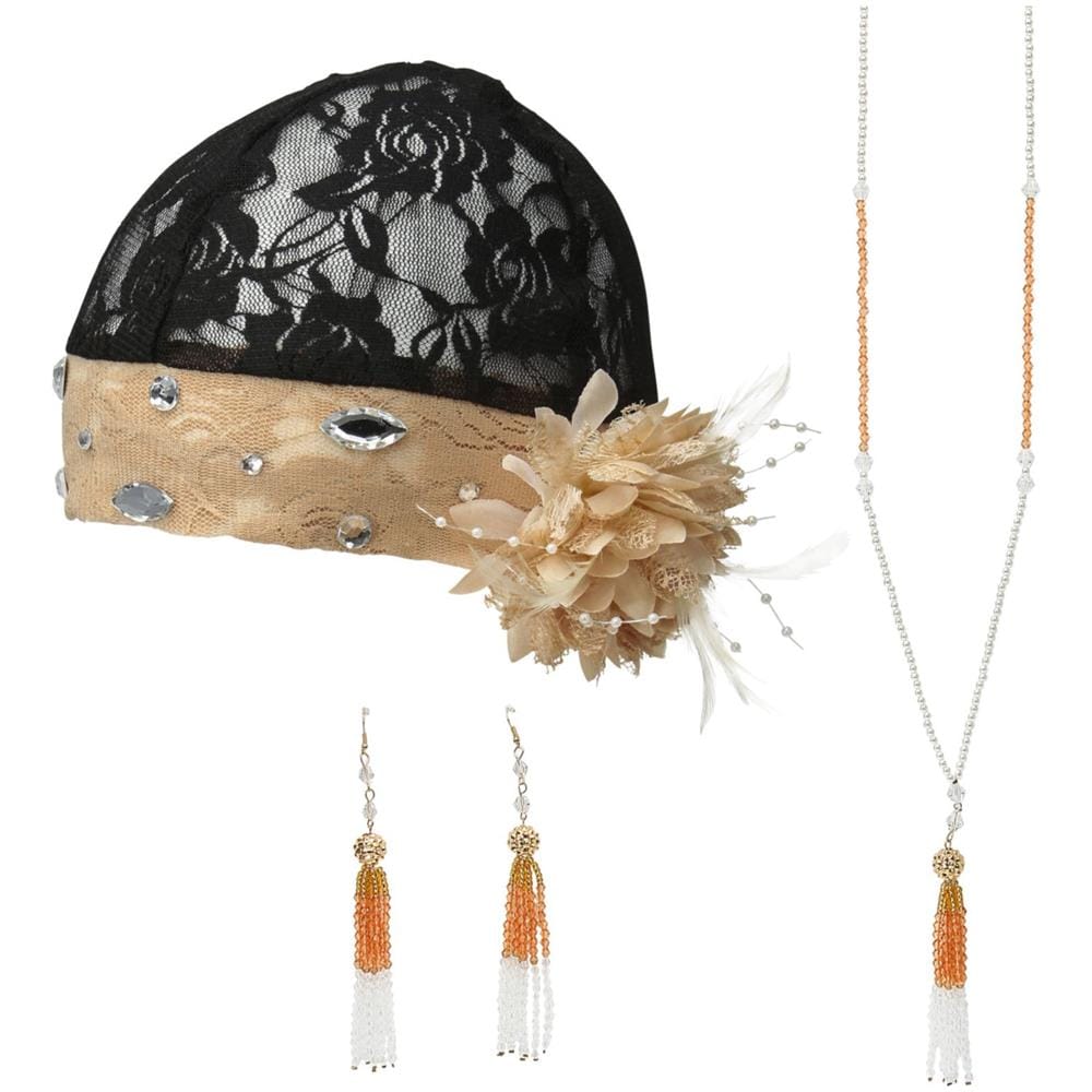 Questo kit di accessori in stile charleston è per donna. Comprende un copricapo, un paio di orecchini ed una collana. Il copricapo è in pizzo nero e beige. Alla base, è decorato con strass ed un fiore in tessuto. Gli orecchini e la collana sono fatti con perle di plastica color bianco, ocra e oro. Ideali per completare un travestimento per una festa a tema!.