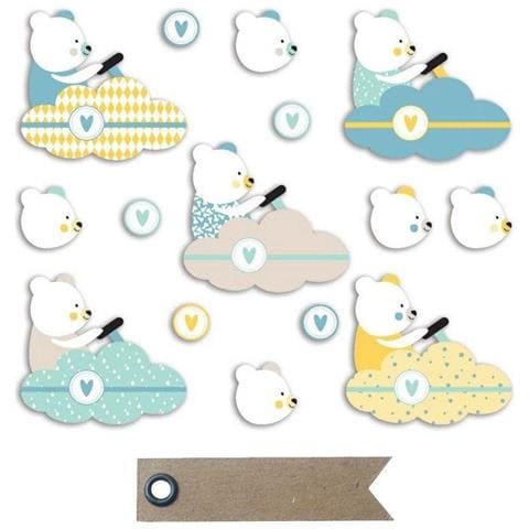 Fustelle blu toga della collezione leonard.queste 20 forme di taglio molto belle serviranno per illustrare un annuncio di nascita o per decorare il taccuino di un bambino.altrimenti chiamato truciolato o fustellato, le forme tagliate sono decorazioni di carta di varie forme e dimensioni.questi rappresentano un orso alla guida di un'auto nuvola su tonalità di blu-grigio-giallo, così come piccoli...