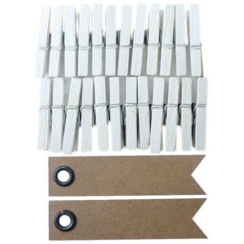 24 Mini Mollette Bianche + 20 Etichette Kraft Con Gagliardetto