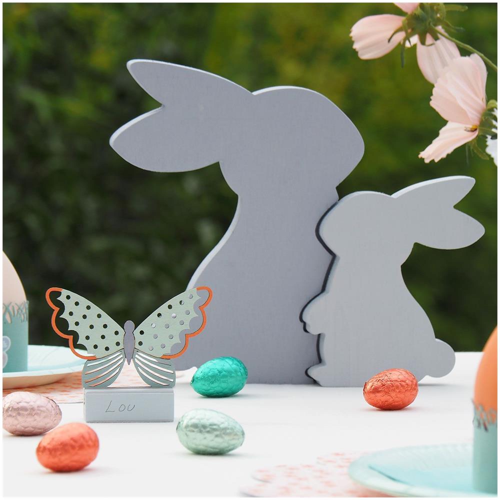 Set di due figure decorative in legno a forma di coniglio. Queste due figure si incastrano come matrioske. Ideali per creare una simpatica decorazione per la pasqua, si possono personalizzare con la vernice, ad esempio, o lasciare così come sono in legno naturale. Dimensioni: 20 x 20 x 2,5 cm.