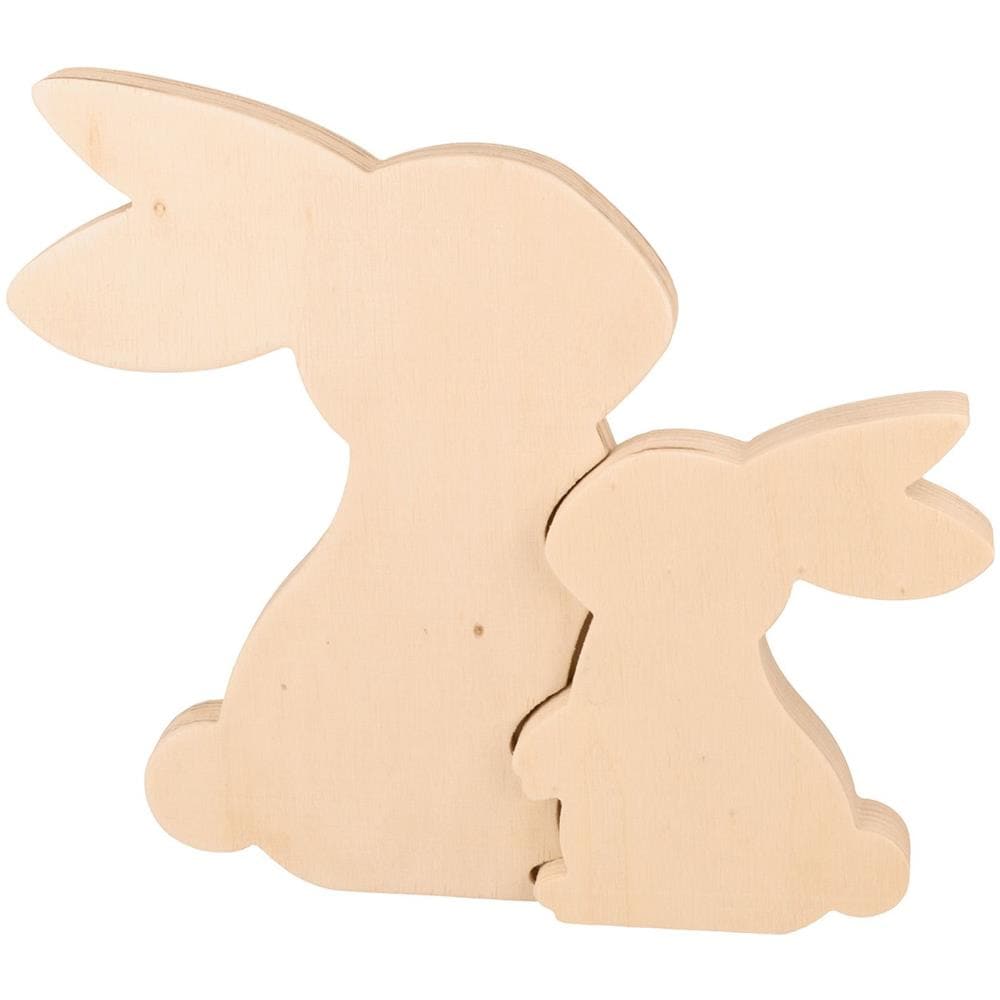 Set di due statuette decorative in legno a forma di coniglio. Queste due figure si incastrano come matrioske. Ideali per creare una simpatica decorazione per pasqua, si possono personalizzare con la vernice, ad esempio, o lasciare così come sono in legno naturale. Dimensioni: 20 x 23 x 2,5 cm.