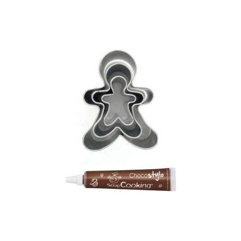 3 Mini Tagliabiscotti In Acciaio Inox Omino Di Marzapane + Penna Alimentare Al Cioccolato