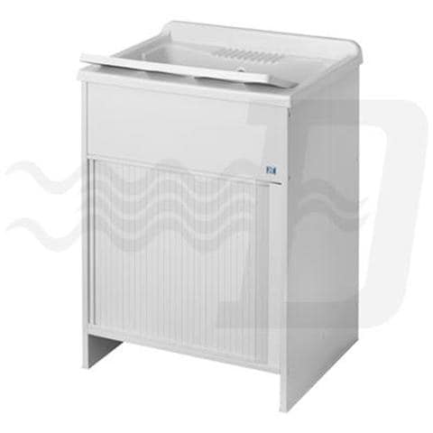 Altezza cm. 85. Mobile in materiale plastico. Indicato per gli ambienti umidi o per l'esterno. L'apertura a serrandina facilita il passaggio negli ambienti ristretti. Vasca in resina sopeciale M. R. A. - Asse di lavaggio in PP. Sifone Autopulente e completo di troppopieno. Piedini regolabili in altezza.