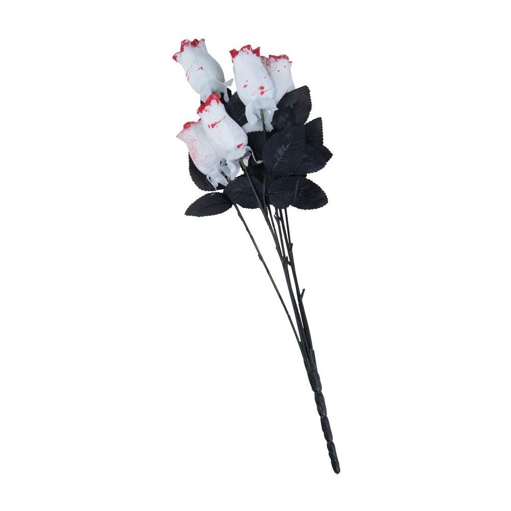 Questo accessorio pensato per la notte di halloween è dato da un bouquet di 6 rose di stoffa insanguinate. Le rose sono bianche, ricoperte di macchie di sangue e fissate su steli neri in modo da raggiungere una lunghezza di 23 cm. Il bouquet può diventare l'accessorio ideale per completare il tuo costume da sposa cadavere in occasione di halloween o di una serata horror.