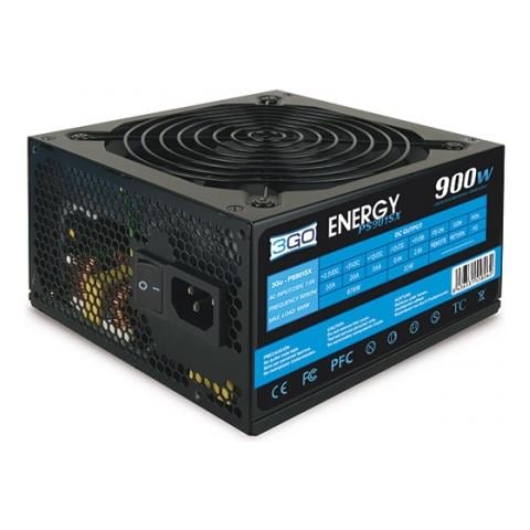 3GO PS901SX. Potenza totale: 900 W, Tipo di correttore del fattore di potenza (PFC) : Passivo, Corrente massima di uscita (+3.3V) : 30 A. Diametro del ventilatore: 12 cm, Numero di ventole: 1 ventola (e) , Collocazione ventole: Alto. Connettore scheda madre: 20+4 pin ATX. Fattore di forma: ATX, Utilizzo: PC, Emissione acustica: 20 dB. Colore del prodotto: Nero