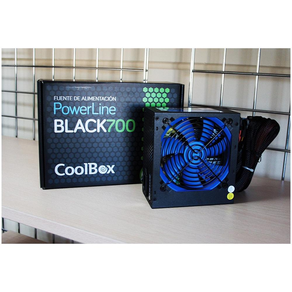 CoolBox Powerline Black 700. Potenza nominale: 700 W, Tensione di ingresso AC: 220 V, Frequenza di ingresso AC: 50 - 60 Hz. Diametro del ventilatore: 12 cm. Connettore scheda madre: 20+4 pin ATX. Fattore di forma: ATX, Utilizzo: PC, Versione ATX: 2.31. Colore del prodotto: Nero, colore d'olluminazione: Blu