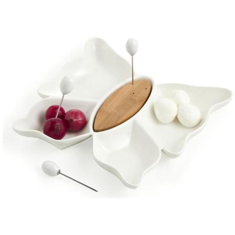 Antipastiera Butterfly Bianca Porcellana Bamboo con 3 Forchette Inox