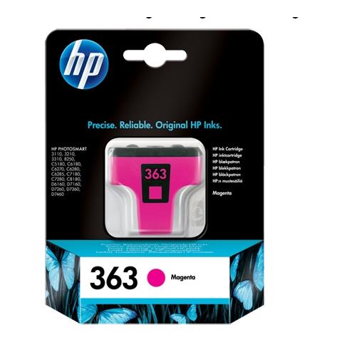 HP 363. Tipo di inchiostro a colori: Inchiostro colorato, Tipo di cartuccia: Resa standard, Resa in pagine dell'inchiostro a colori: 370 pagine, Colori di stampa: Magenta per foto, Quantità per pacco: 1 pz